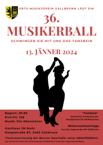 Der Orts-Musikverein Gallbrunn lädt zum 36. Musikerball ein. Schwingen Sie mit uns gemeinsam in GH Muhr das Tanzbein.